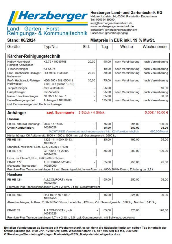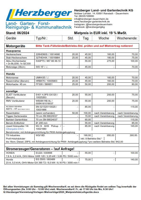 Die Vermietung der Geräte erfolgt unter Zugrunde legen unserer Bedingungen für die Vermietung von Maschinen und Geräten.